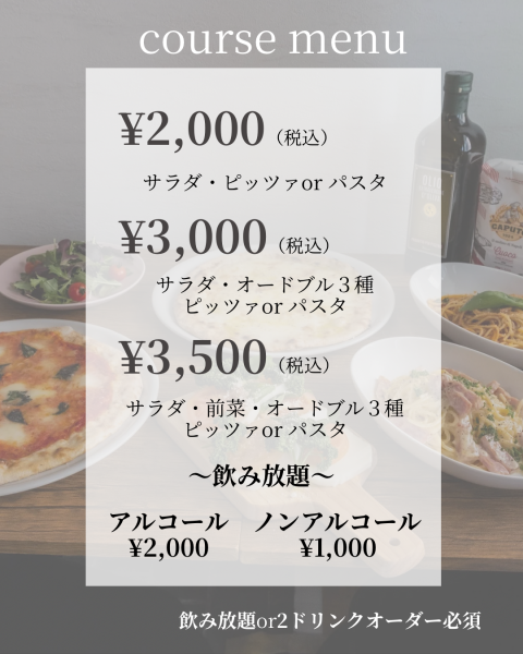 ※こちらは飲み放題or2ドリンクのオーダーが必須となっております!